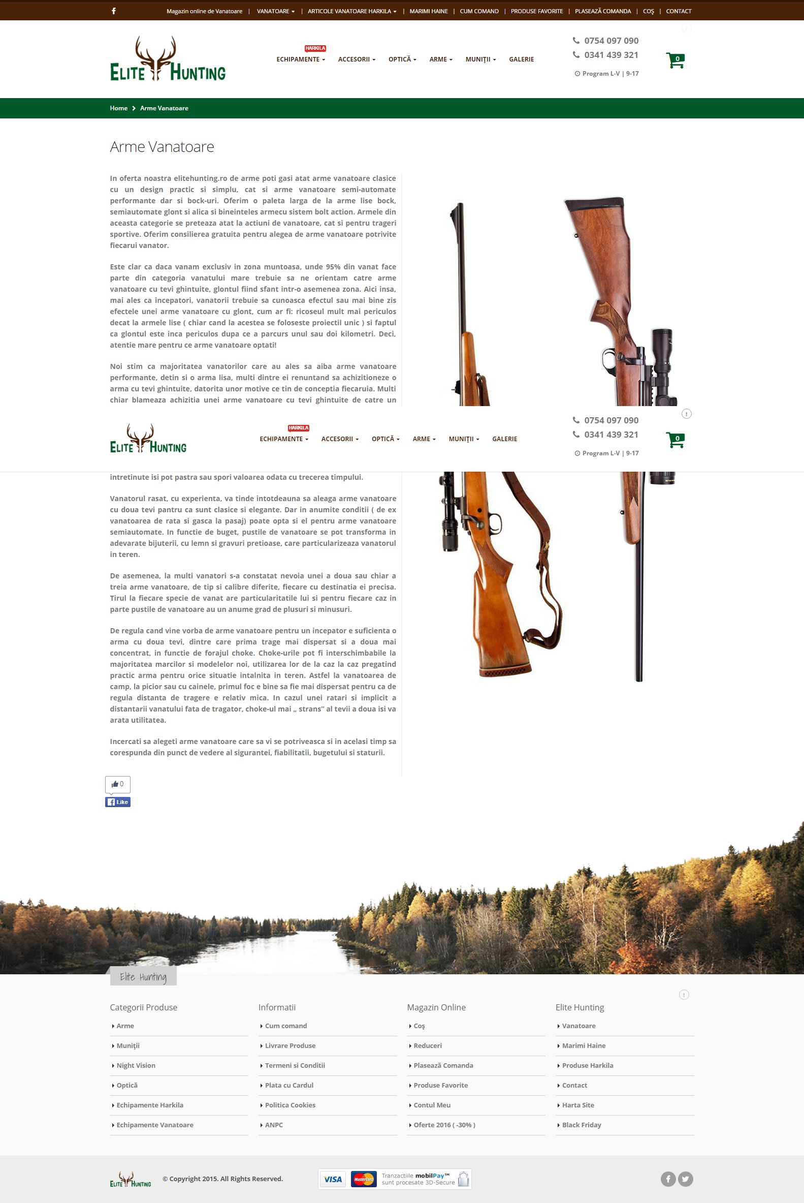 In oferta noastra elitehunting.ro de arme poti gasi atat arme vanatoare clasice cu un design practic si simplu, cat si arme vanatoare semi-automate performante dar si bock-uri. Oferim o paleta larga de la arme lise bock, semiautomate glont si alica si bineinteles armecu sistem bolt action. Armele din aceasta categorie se preteaza atat la actiuni de vanatoare, cat si pentru trageri sportive. Oferim consilierea gratuita pentru alegea de arme vanatoare potrivite fiecarui vanator.Magazin online articole de vanatoare.